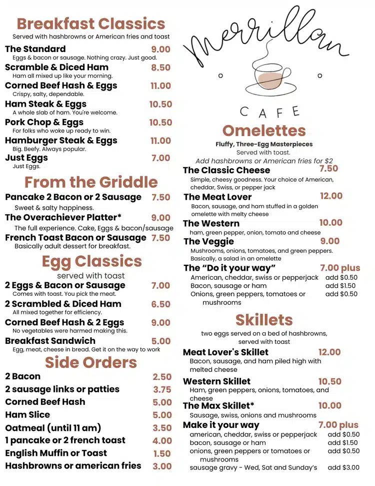 Serving breakfast and lunch daily, Merrillan Cafe is known for its homestyle cooking, generous portions, and no-shortcuts approach—especially when it comes to customer favorites like homemade sausage gravy, classic egg breakfasts, and stacked sandwiches. From burgers and melts to soups, salads, and daily specials, there’s something on the menu for every appetite.