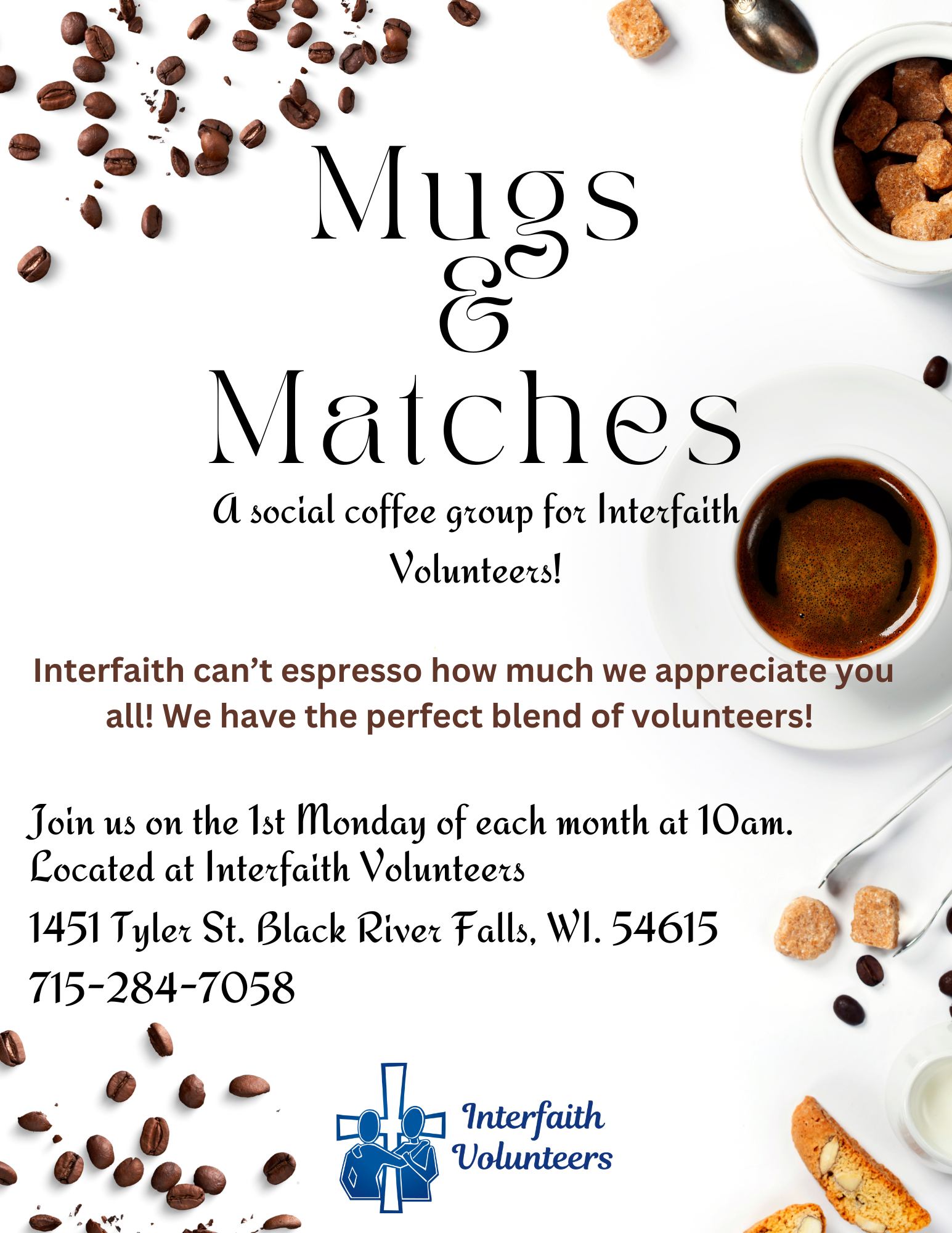 We are extending a warm welcome to Interfaith Volunteers to join together for coffee and conversation on Mondays. Coffee is served at 10 am the first Monday of each month. If you are not a fan of coffee, no worries—we have tea, hot chocolate, and bottled water, too. Come and catch up with fellow volunteers! See you Monday!