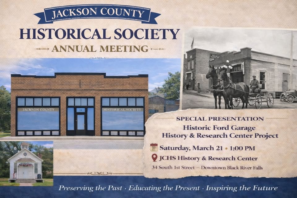 Jackson County Historical Society Annual MeetingJoin us for celebrating local history and exciting plans for the future! Saturday, March 21 1:00 PM JCHS History & Research Center34 South 1st Street – Downtown Black River Falls Special Presentation:Historic Ford Garage History & Research Center ProjectCome view the architectural designs and [...]