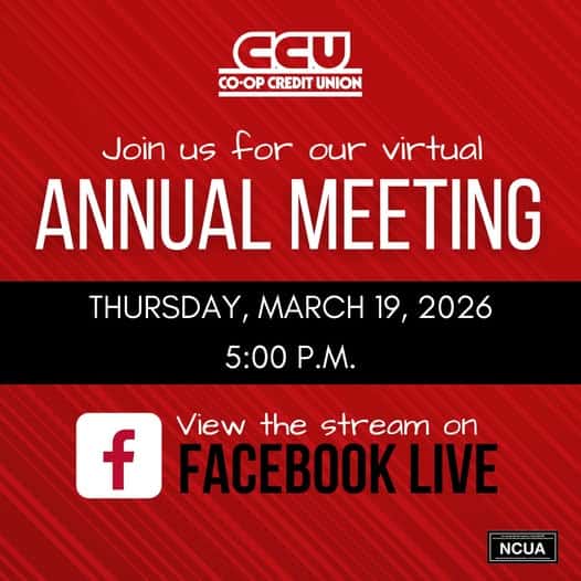 Mark your calendars! Join us for CCU's 88th Annual Meeting, happening virtually on Thursday, March 19, at 5:00 p.m. Don't miss this opportunity to learn about the status and progress of YOUR credit union!