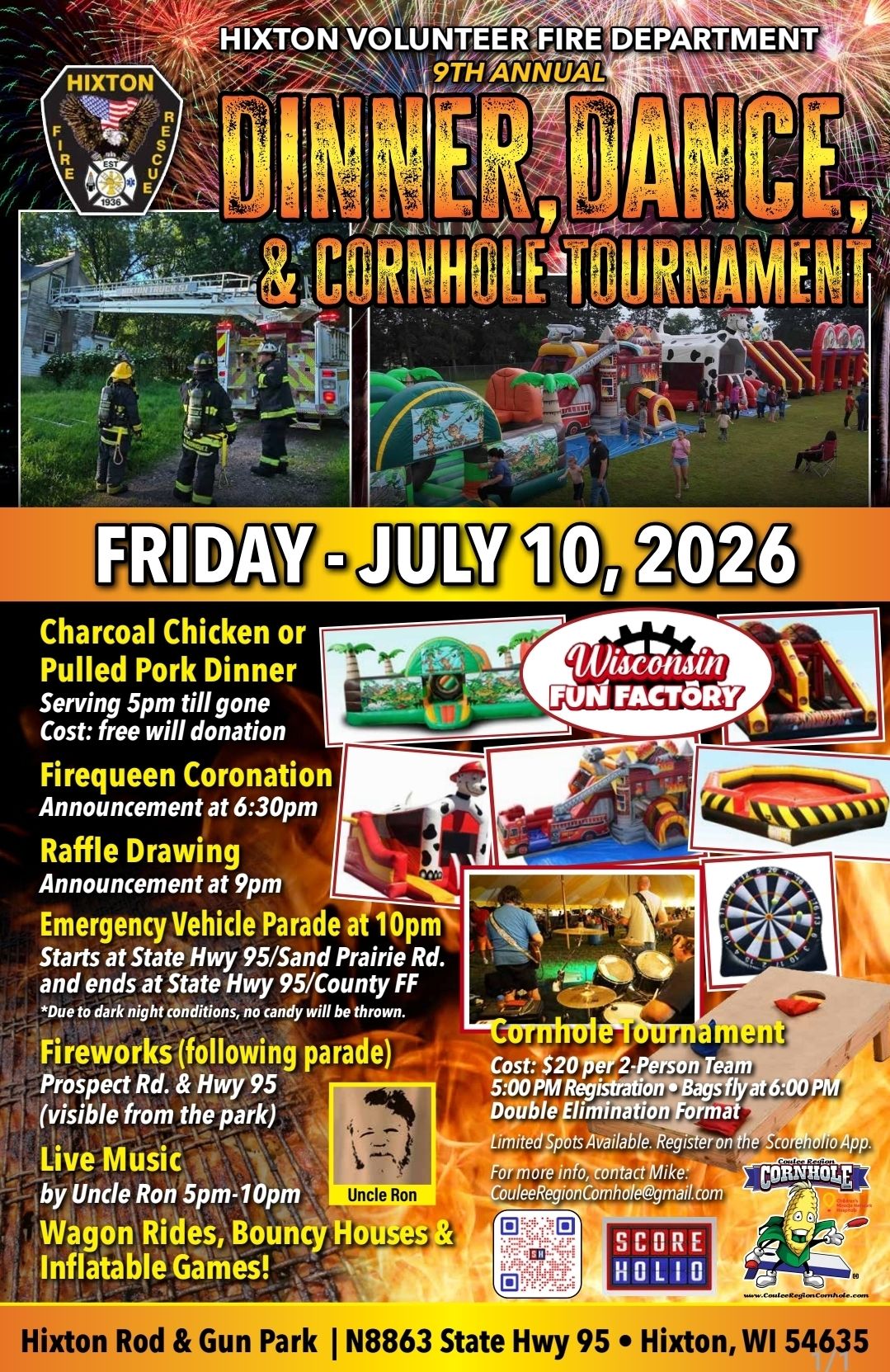 9th Annual Hixton Volunteer Fire Department Dinner, Dance, & Cornhole Tournament. Jul 10 9th Annual Hixton Volunteer Fire Department Dinner, Dance, & Cornhole Tournament. 5:00 PM - 10:00 PM